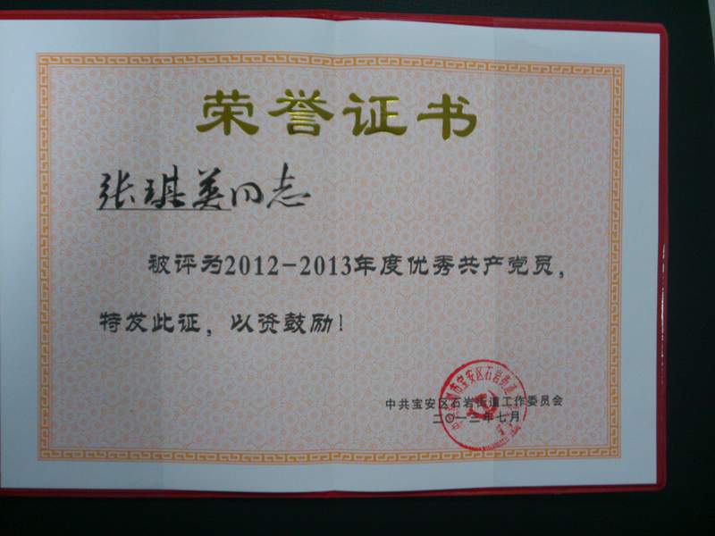 在中國(guó)共產(chǎn)黨成立92周年之際,石巖街道黨委對(duì)轄區(qū)企業(yè)優(yōu)秀共產(chǎn)黨員進(jìn)行了表彰,我公司張琪英被授予2013年度石巖街道優(yōu)秀共產(chǎn)黨員榮譽(yù)稱(chēng)號(hào)。